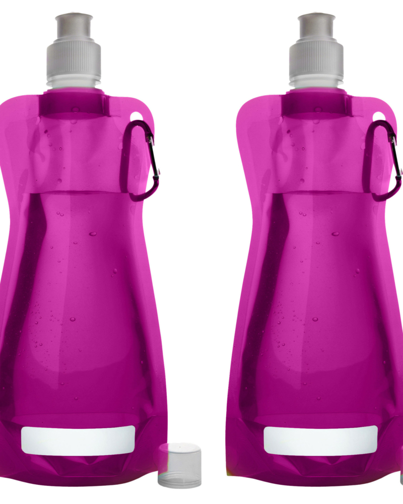 2x waterfles of drinkfles opvouwbaar en lekdicht in het fuchsia roze. Met schroefdop/kliksluiting en een handige karabijnhaak. Afmeting: ca. 26,5 x 11,9 x 3,1 cm. Inhoud: ca. 420 ml. Materiaal: PP kunststof. Gewicht: 24 gram. Deze handige opvouwbare en ruimtebesparende waterfles is ideaal voor elke situatie zoals op het strand, een lange wandeling of op een festival.