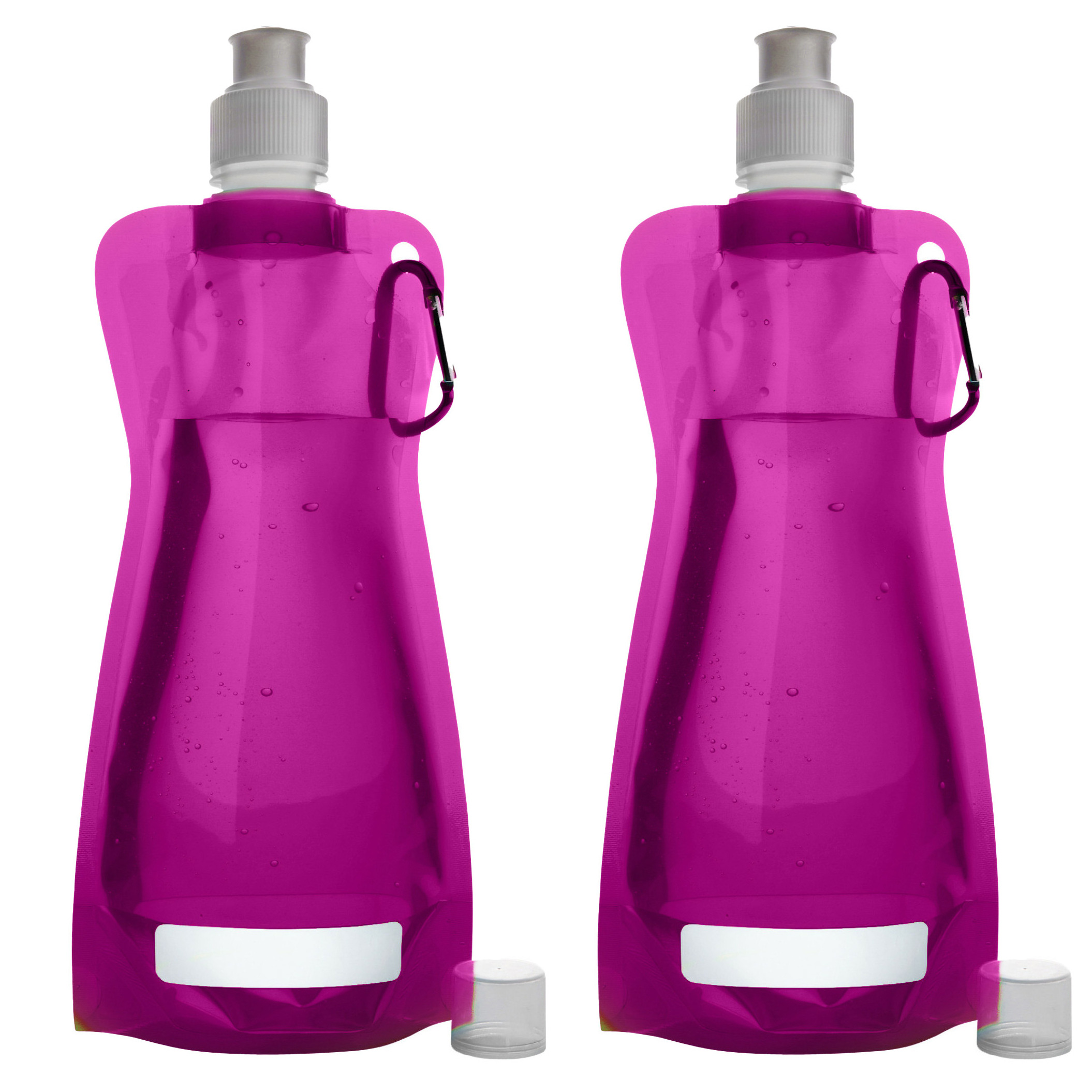 Waterfles/drinkfles opvouwbaar – 2x – fuchsia roze – kunststof – 420 ml – schroefdop – karabijnhaak
